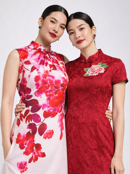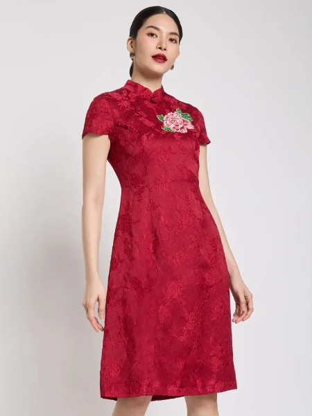 ชุดเดรสผู้หญิงคอจีน แขนล้ำ ดีเทลปักลายดอกไม้ สีแดง ซื้อ 1 ชิ้น
