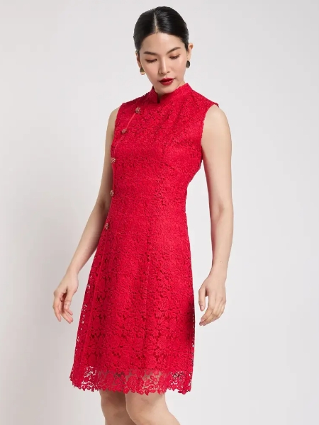 ชุดเดรสผู้หญิงคอจีน แขนกุด ผ้าลูกไม้ แต่งดีเทลกระดุม สีแดง ซื้อ 1 ชิ้น