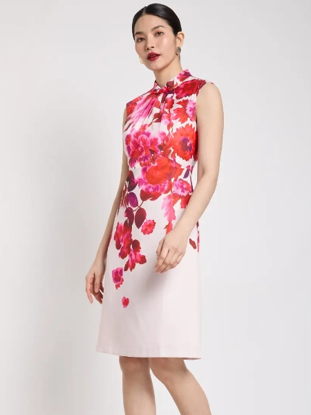 ชุดเดรสผู้หญิงทรงสอบ แขนกุด คอจีน ผ้าพิมพ์ลายดอกไม้ สีชมพู ซื้อ 1 ชิ้น